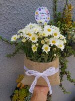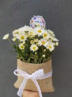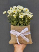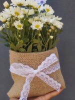 Arranjo para mesa de convidados com saquinho de juta delicadamente finalizado com laço de renda. Ideal para mesas de 6 lugares, traz um toque natural e sofisticado ao seu evento.