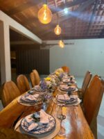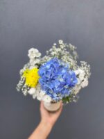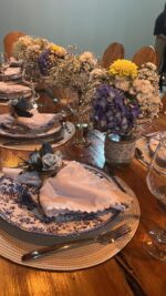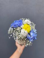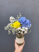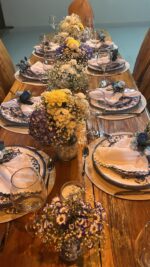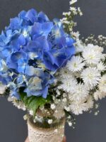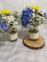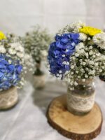 Arranjo sofisticado em vidro com acabamento em juta e renda, perfeito para mesas de 6 lugares. Cada peça combina a beleza de flores selecionadas como Hortênsia, Gipsofila, Aster e outras espécies que trazem charme e frescor ao seu evento.