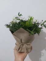 Encante seus convidados com um arranjo exclusivo, finalizado com juta e laço de sizal, combinando folhagens diversas e flores mistas na cor branca ou na tonalidade de sua preferência. Ideal para mesas de 6 lugares, trazendo charme e harmonia ao seu evento.