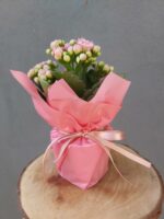 Arranjo para mesa de convidados decorado com embalagem de celofane com TAG personalizada de agradecimento, laço de cetim fino e uma linda Kalanchoe