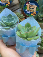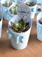 Presenteie com um toque especial da natureza! Cada vasinho é decorado com rótulo poá e lacinho offset azul, acompanhado de uma tag personalizada para diversas ocasiões: chá revelação, maternidade, casamento, eventos corporativos e agradecimento.